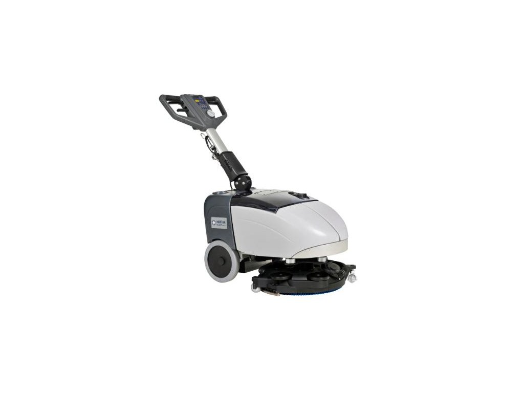 Nilfisk SC351 jeden z nejmenších podlahových - bateriových - mycích strojů s diskovým kartáčem.